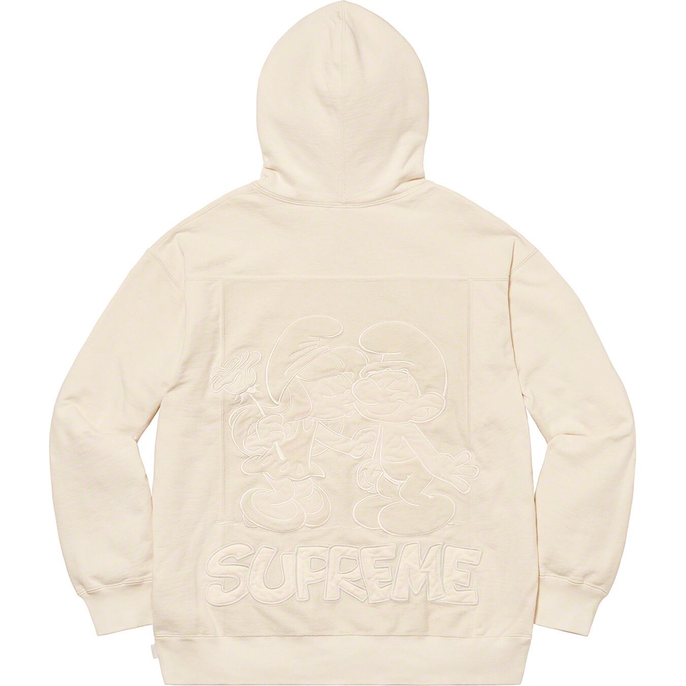 バックにあえて同色系で大きくスマーフのグラフィックと「スマーフ」のタイトルフォントに似せたSupremeのロゴをアップリケで施している。